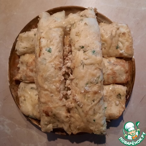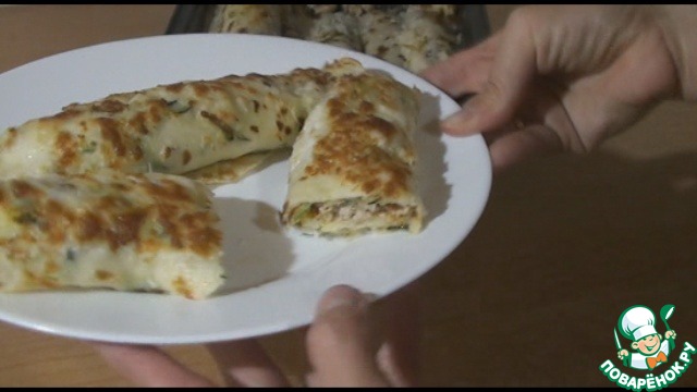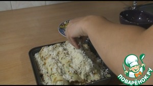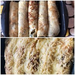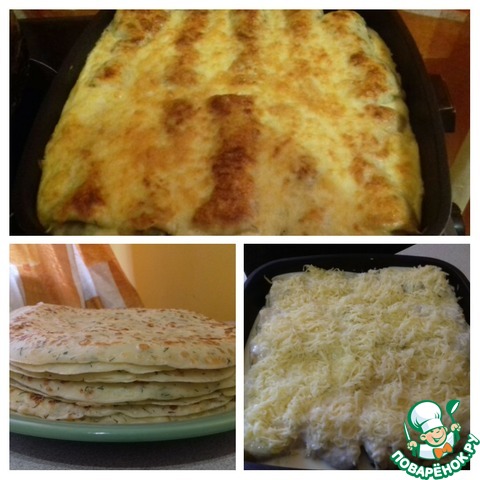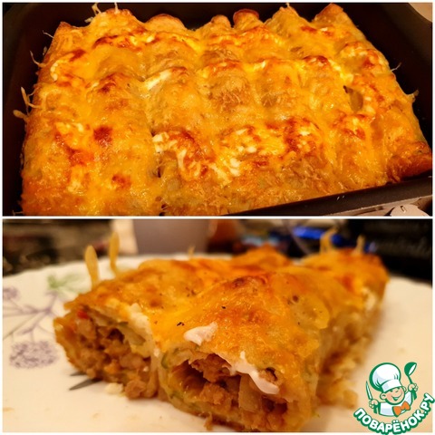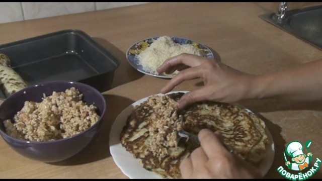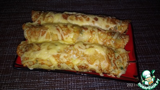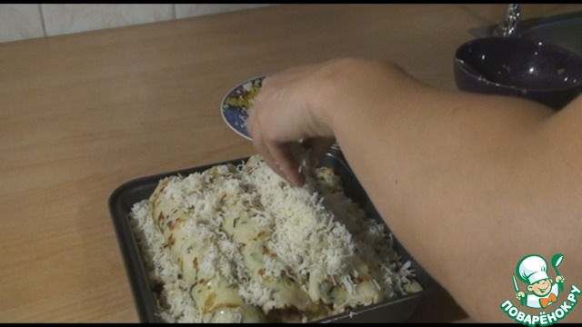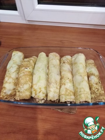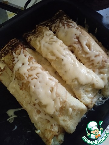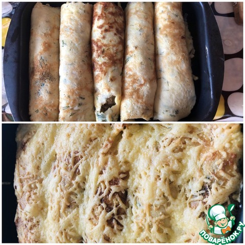 Сверху блинчики посыпаем натертым сыром. Запекаем в разогретой до 180 градусов духовке 20 минут.