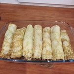 У меня из этого количества получилось 8 блинчиков. Форму для запекания смажем немного маслом. На блинчик выкладываем немного фарша и сворачиваем удобным вам способом. Выкладываем в форму.