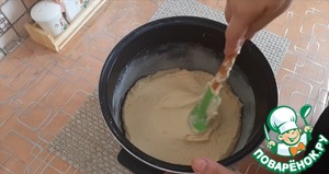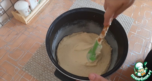 Выкладываем тесто в форму мультиварки, смазанную сливочным маслом и присыпанную мукой.
