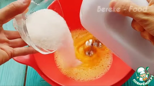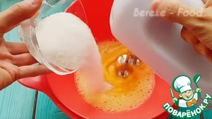 Яйца взбиваем миксером, затем добавляем сахар в 2-3 приема, ванильный сахар хорошо взбиваем. Далее добавляем муку в 2-3 приема, взбиваем.