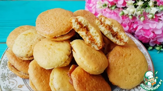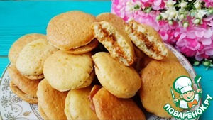 Одну сторону готовых печеньек смазываем варенной сгущенкой и насаживаем на нее 2 печеньку.