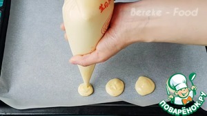 Теперь кладем соду, лимонную кислоту, соль и снова взбиваем. И для удобства перекладываем в кондитерский мешочек. Отсаживаем небольшими кружочками, на подготовленный противень застеленный пергаментом.