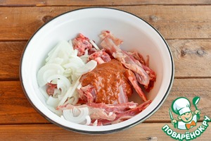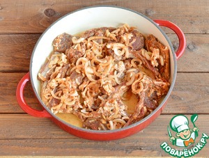 Сложите ребра с луком и маринадом в сотейник, влейте воду, накройте крышкой и поставьте в нагретую до 160-180°С духовку. Готовьте около 1,5 - 2 часов. Периодически заглядывайте, смотрите, чтобы жидклсть не выкипала, если нужно, подливайте кипяток -