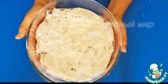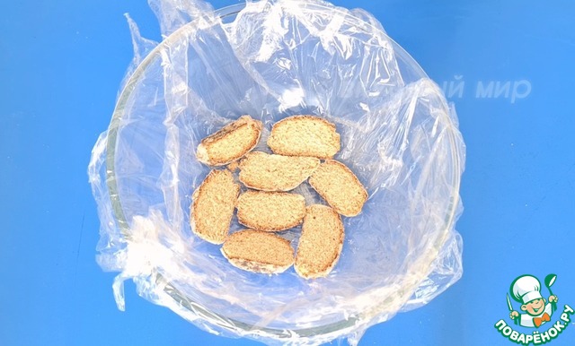 Подготавливаю миску, в которой буду формировать торт из пряников. Для этого застилаю её пищевой пленкой. Затем выкладывать кружки из пряников на блюдо.
