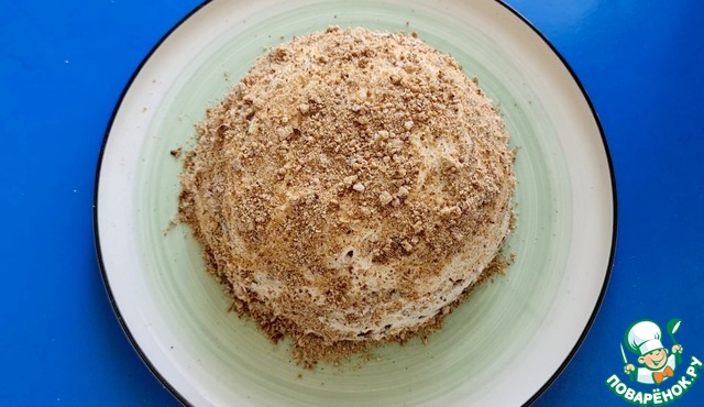 Торт еще немного обмазываю сметаной и посыпаю подготовленной крошкой из обрезков.