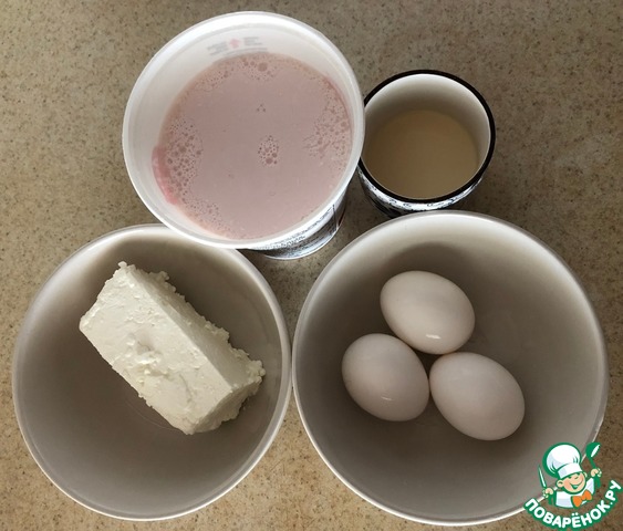 Взбиваем блендером в однородную массу творог, топленое молоко, йогурт, яйца с ванильным сахаром. Жирность ингредиентов может быть выбрана на свой вкус. Чем выше жирность, тем вкуснее десерт. Если используется йогурт без добавления сахара, то его нужно добавить на свой вкус. В моем случае йогурт был сладкий, поэтому сахар не добавляла.