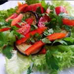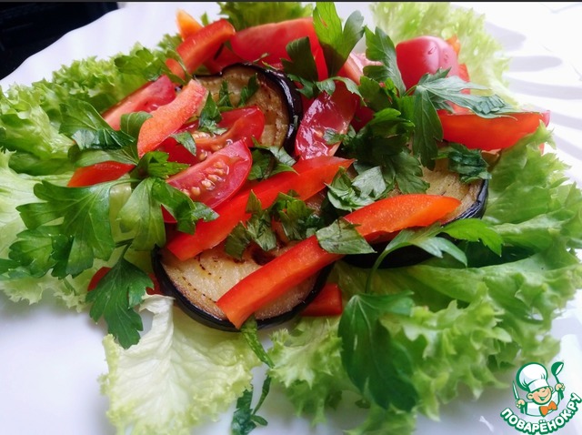 Баклажаны очистить, нарезать кружочками и обжарить на растительном масле. Тем временем в салатник выложить Черри нарезанные на четвертинки. Перец болгарский нарезать соломкой, чеснок пропустить через пресс. Добавить соль и перец молотый. Красный лук нарезать полу кольцами. Выложить готовые баклажаны, салат перемешать. При подаче на тарелку выложить листья салата.