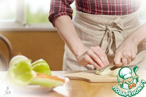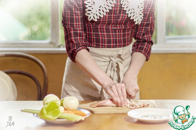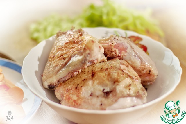 С курицы срежьте лишнюю кожу. Обжарьте бедрышки в жире от бекона, чтобы они стали слегка золотистыми.