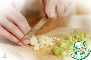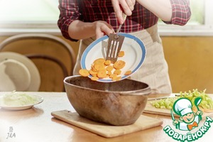 Бекон порежьте на мелкие кусочки и обжарьте до полного вытапливания жира. Получатся хрустящие шкварки. Выньте их шумовкой на блюдо.