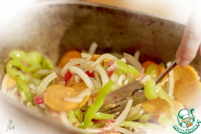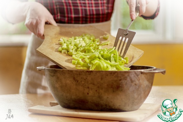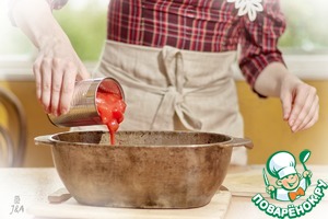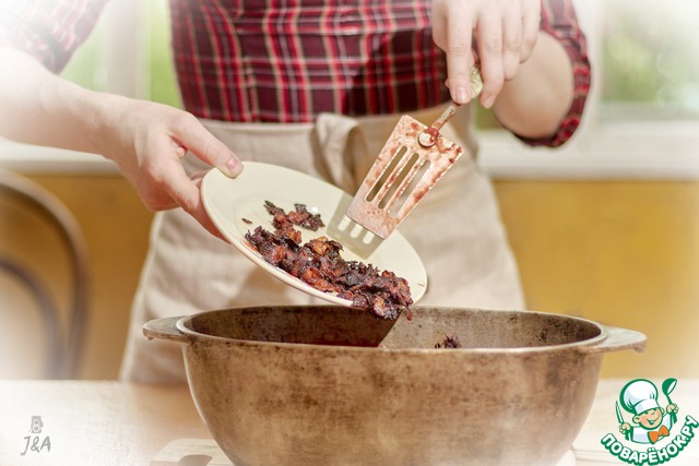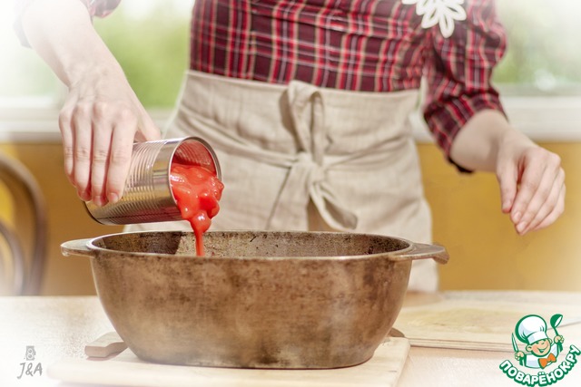 И шкварки. Томить на медленном огне минут 25 до легкого загустения. В процессе попробуйте на соль и сахар. Вообще в любое блюдо, где есть томаты я всегда добавляю немного сахара.