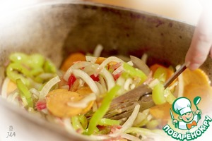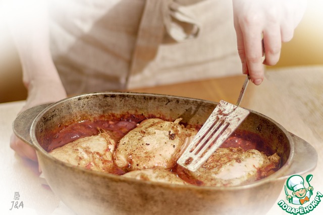 Курицу выложить поверх соуса, очень аккуратно, чтобы она не утонула в нем. Закрыть казан крышкой и снова отправить томиться. Время зависит от объема посуды и количества курицы. У меня это 30 мин. Параллельно разогрейте духовку до 180С.