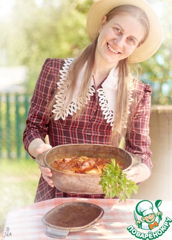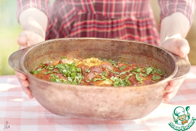 Соус вокруг курицы должен заметно загустеть. Переставьте казан в духовку и запекайте до момента, пока курица не покроется аппетитной корочкой. У меня ушло 20 мин.