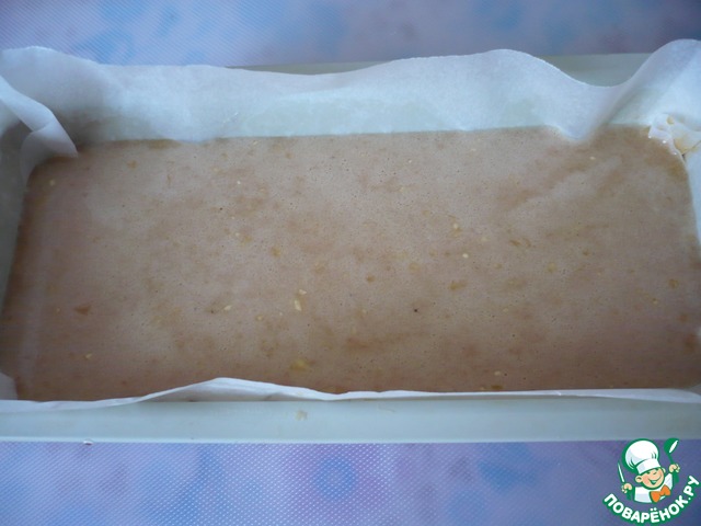 Форму для запекания (размер формы 24.5 х 11) застелить пергаментом. Вылить приготовленное тесто в формочку, накрыть её пищевой пленкой и оставить при комнатной температуре на один час (это - важный момент! Именно в это время происходит "волшебное" преобразование структуры теста. Мука оседает на дно, а верхний слой будущего торта становится более жидким. Именно этот фактор при выпекании придает такой интересный рисунок коржу и объясняет его название).