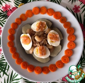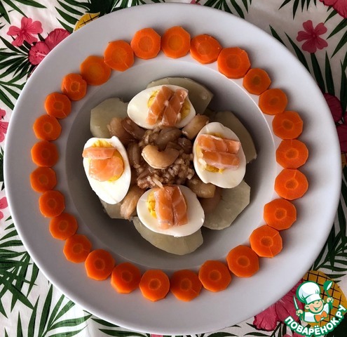 Охлажденный картофель идет первым слоем на тарелке. По желанию можно его покрошить. Нарезаем тоненькими колечками охлажденную морковь и украшаем ею тарелку. В центре укладываются маринованные креветки и вокруг располагаются половинки яиц, на которые выкладываются кусочки семги (без шкурки). Креветки с картофелем поливаются маслом холодного отжима. Приятного аппетита!