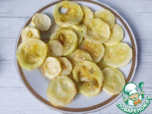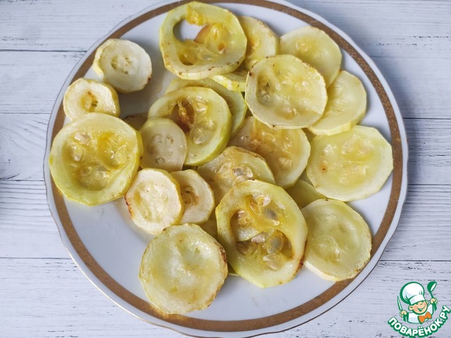 Кабачки обжарить на сковороде. Чтобы овощи не впитывали масло, можно их запечь в духовке в течении 15 мин- 180 градусов.