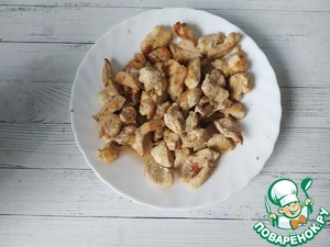 Куриную грудку нарезать на брусочки и обжарить на сковороде до легкого румянца.