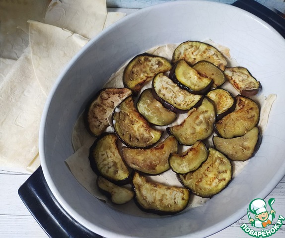 На дно формы вливаем несколько ложек соуса, на него выкладываем лаваш, обрезая его по форме. На верх выкладываем баклажан. Баклажаны заливаем частью соусом.