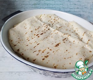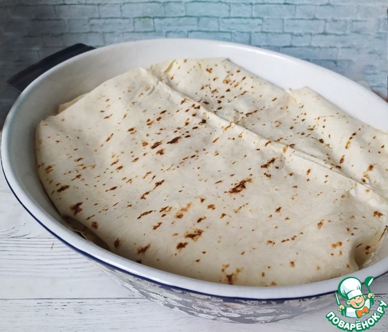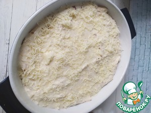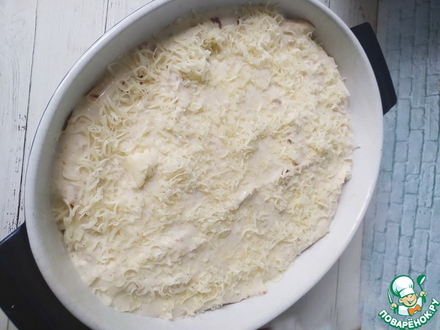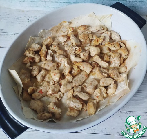 На соус опять выкладываем лаваш, на него куриную грудку и заливаем частью соуса.