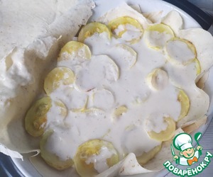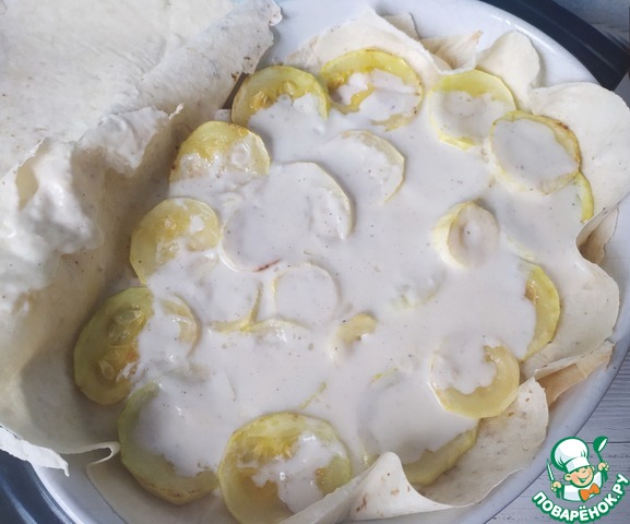 Повторяем с лавашем: на соус выкладываем лаваш, на него - обжаренные кабачки. Заливаем частью соуса.