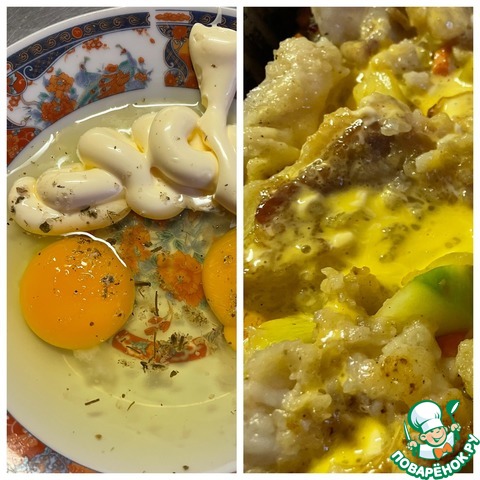 • В противень для запекания выложить овощи, сверху кусочки рыбки. В пиале взбить вилочкой яйца с майонезом или сметаной со всеми специями и залить рыбу. Отправить противень в духовку при 190 гр минут на 15-20.