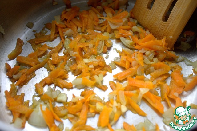 Нарезать небольшую луковицу, чеснок, натереть морковь. Обжарить на оливковом масле в кастрюле с толстым дном.