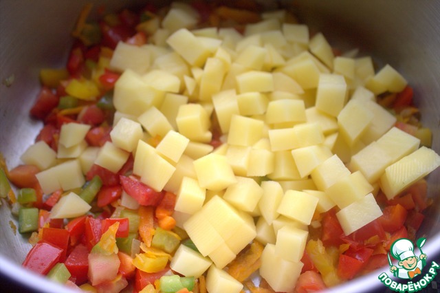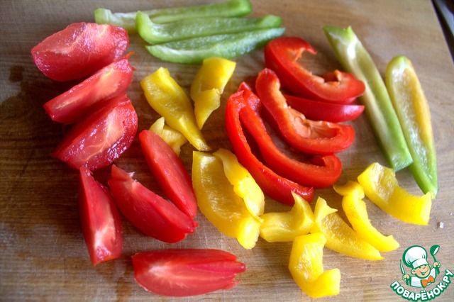 Нарезать болгарский перец (у меня трёх цветов, но это не обязательно) и помидор. Как вариант перцы можно заменить стеблем сельдерея.