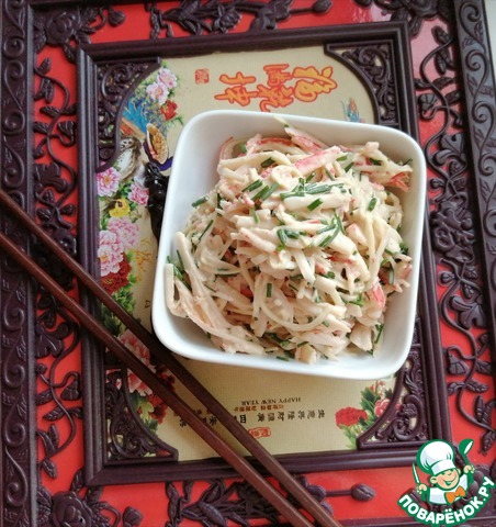 Салат из грибов эноки и крабовых палочек с майонезной заправкой (Эноки каникама но вафу маё аэ) – один из салатов современной японской кухни. Салаты с майонезной заправкой с добавлением капельки васаби очень популярны у японских домохозяек. Вместо крабовых палочек нередко используют отварное куриное филе, нарванное волокнами. Иногда для сытости в такой салат добавляют тертое вареное яйцо и/или отварной белый рис. Такие закуски в японской домашней кухне популярны не меньше, чем у нас – «оливье», «столичный салат» и их производные.