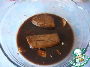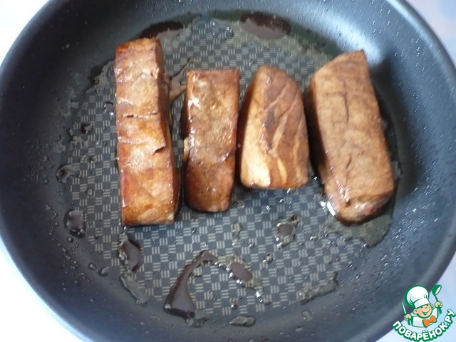 Теперь брусочки обжаренного тунца, снова обмакиваем в маринаде с каждой стороны.