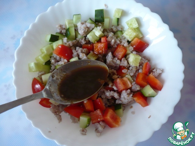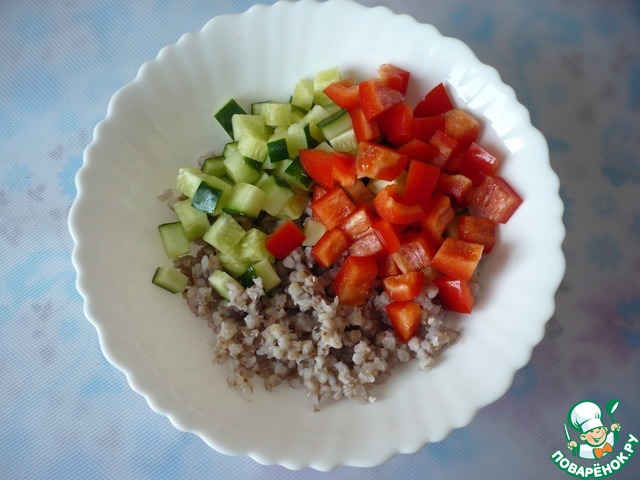 Пока маринуется тунец приготовим гарнир: в виде салата. Для салата предварительно отварите гречневую крупу. В готовом виде нужно 120 гр. гречневой каши. Небольшими кубиками нарезать огурец и добавить к каше.