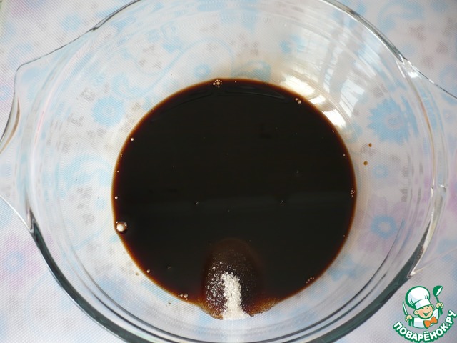 Приготовим маринад: в миску насыпаем сахар, добавляем рисовый уксус, водку, соевый соус. Все хорошо перемешиваем.