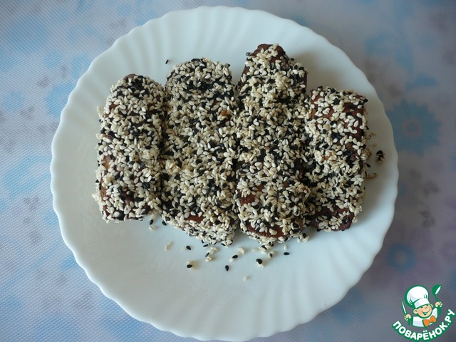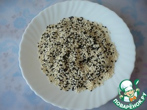 Панируем брусочки обжаренного тунца в семенах кунжута. Чтобы тунец стал немного поплотнее можно поставить его на несколько минут в холодильник (будет удобнее нарезать).