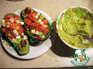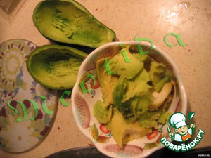 Авокадо разрезаем пополам, удаляем косточку, ложкой вынимаем мякоть, и измельчаем ее в миске блендером