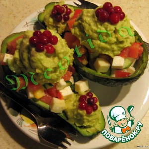 Выкладываем немного соуса из авокадо в лодочки и украшаем цветочком из клюквы