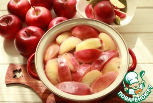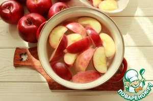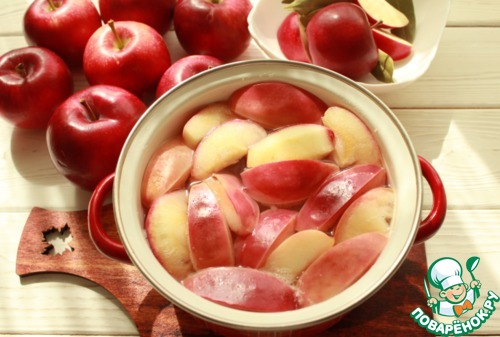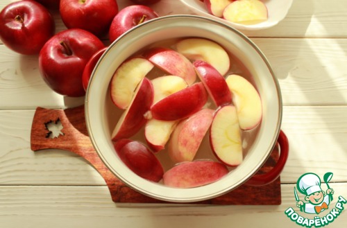 Вскипятить воду с сахаром (до растворения сахара). Добавить вымытые яблоки, нарезанные на произвольные куски без сердцевины.