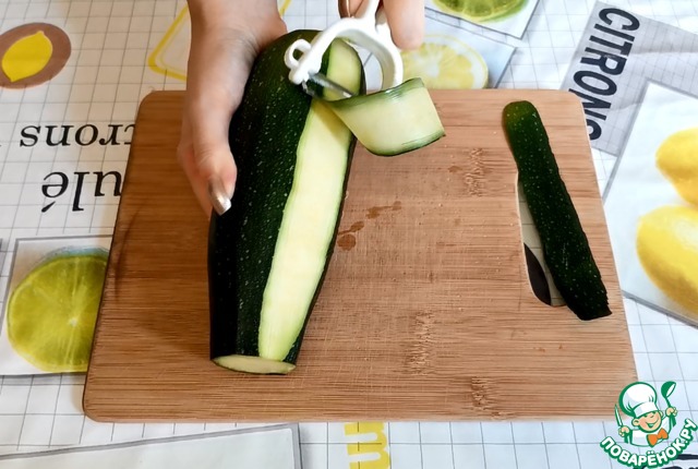 Для начала подготовим кабачки. Их нужно вымыть и нарезать длинными тонкими ломтиками.