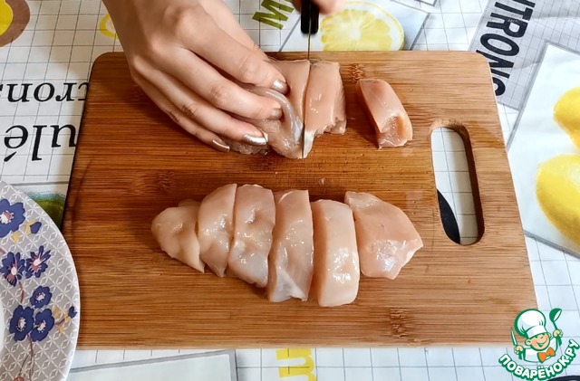 В рулетики я буду заворачивать куриное филе. Поэтому нарезаем мясо на соответствующие кусочки.