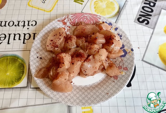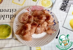 Кусочки филе нужно посолить. Еще посыпаем молотым черным перцем, я добавлю немного острого перца.