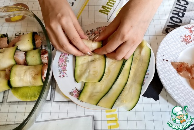 Тем временем ломтики из кабачков стали мягкими. Заворачиваем кусочки куриного филе в ломтики кабачка рулетиком и выкладываем в форму для запекания.