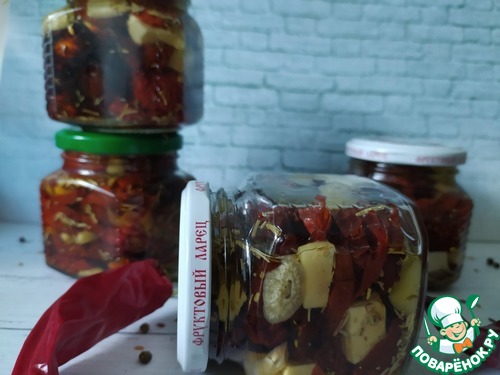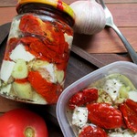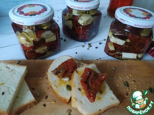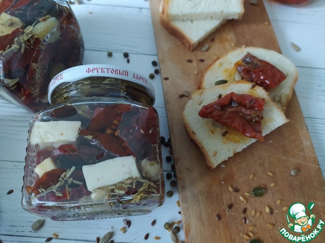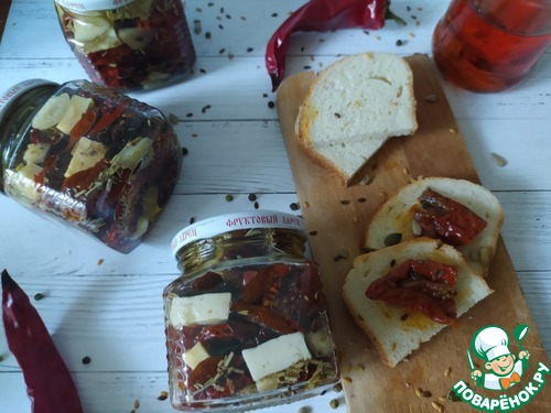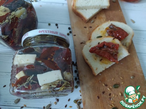 Влейте в банку немного масла, положите измельченный чеснок и сухие травки. Далее слой помидор, брынза, порезанная кубиками 1х1см, а затем снова травы с чесноком. Опять проливаем маслом. Укладывая слоями, заполните всю баночку. Залейте вяленые томаты оливковым маслом, заполняя пустоты.