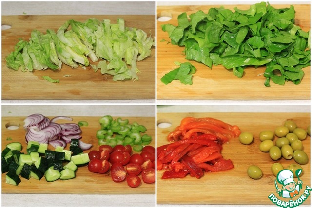 Оба вида салата нарезать на тонкие полоски.
