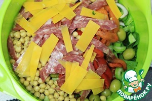 Выложить нарезанный салат, нут и нарезанные овощи в большую миску.