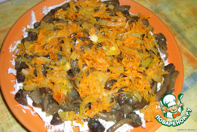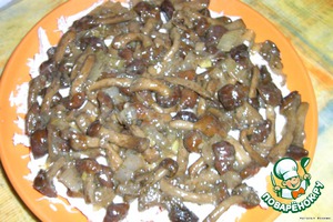 Далее укладываем грибы обжаренные с луком на растительном масле