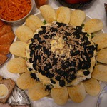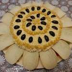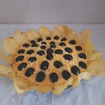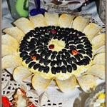 Теперь вокруг выкладываем чипсики и украшаем серединку посыпем тертым желтком-можно сделать такую пчелку из маслинки и оливки, а крылья из морковки или огурчика