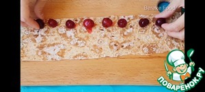 На полоски выкладываем по 8- 9 штучек вишенек и заворачиваем в трубочку. И так проделываем со всеми полосками лаваша. Лишние края с двух сторон срезаем.