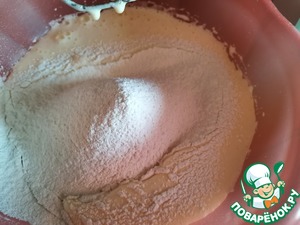 Затем влить кефир и яблочный сок. Добавить просеянную муку с разрыхлителем. Перемешать. (Я быстро взбила миксером.)