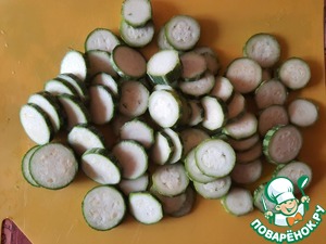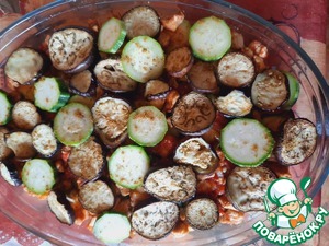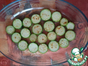 Выложите в форму для запекания слой кабачков и приправьте их приправой к мясу и овощам.