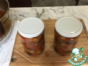 Закуску выкладываем в стерилизованные баночки, для стерилизации банок я кладу их с крышками в духовку на 15 минут при температуре 150 градусов.