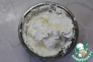 Отдельно взбить белки с 20 грамм сахара до плотных пиков.