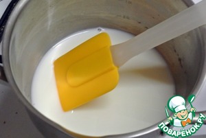 Оставшееся молоко смешать с оставшимся сахаром и вылить в сотейник.