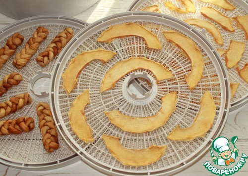 4. Сушить в электросушилке при температурном режиме 55°С-65°С около 12-16 часов (время сушки зависит от сочности плода).